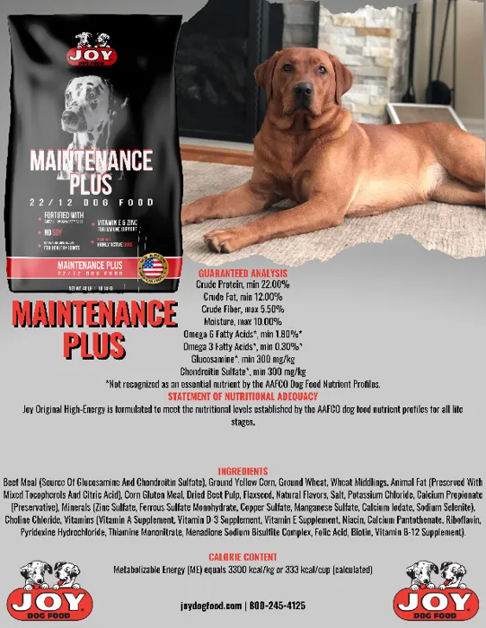 Joy Maintenance Plus is formulated to meet the nutritional levels established by the AAFCO dog food nutrient profiles for all life stages.