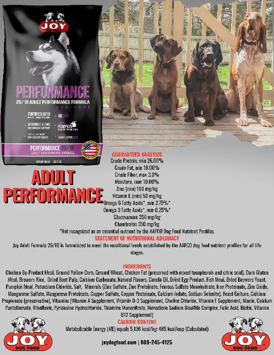 Joy Adult Formula 26/18 is formulated to meet the nutritional levels established by the AAFCO dog food nutrient profiles for all life stages