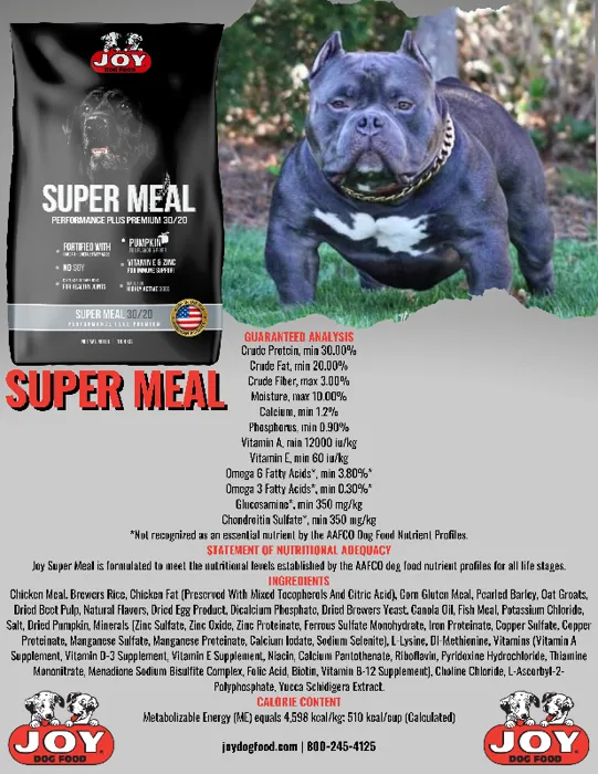 Joy Super Meal is formulated to meet the nutritional levels established by the AAFCO dog food nutrient profiles for all life stages.