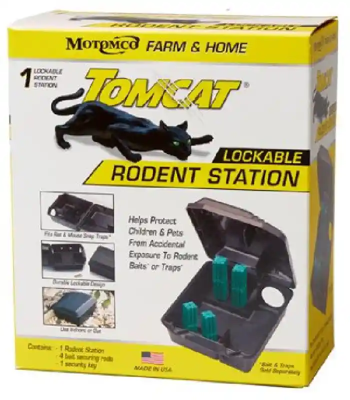 Tomcat Bait Stations provide security by keeping bait out of reach of children, pets, livestock and non-target animals. They increase the effectiveness of any bait by protecting it from the elements and providing a sheltered area where rodents feel comfortable feeding. The Tomcat Rodent Station is an excellent value for customers looking to upgrade to the security of a tamper-resistant bait station. It locks when closed and is unlocked with a special 2-pronged key.