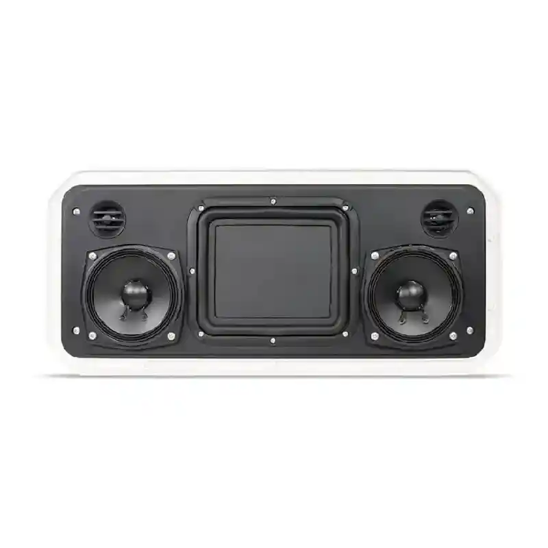 Optimally tuned, sealed enclosure with two 4” speakers, two tweeters and a passive bass radiator.