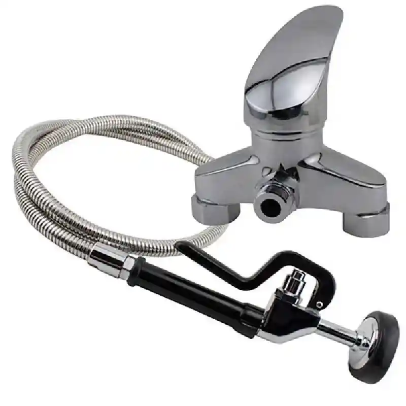 This professional stainless steel lever faucet kit comes complete with 4 inch center faucet and Paw Brothers Professional Stainless Steel Spray Hose Complete.