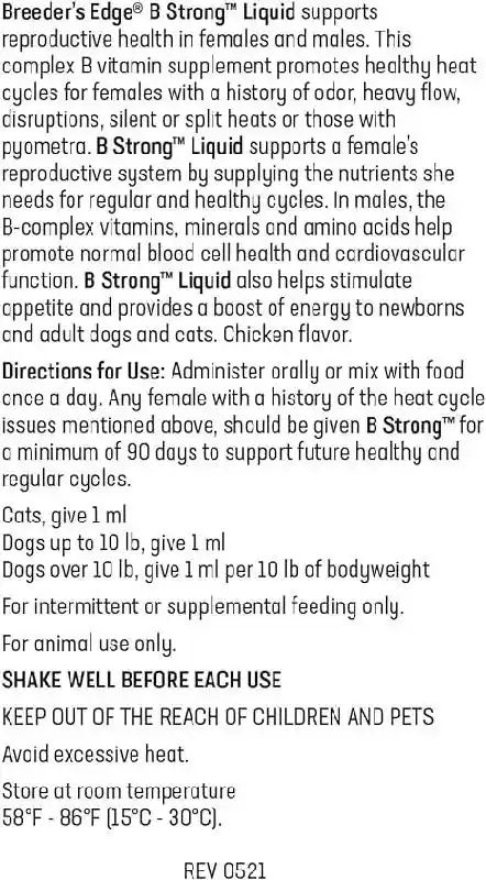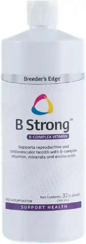 Breeder's Edge® B Strong™ Liquid and Powder are a B complex vitamin for dogs and cats that supports reproductive health. B Strong™ promotes healthy heat cycles for females by providing the nutrients she needs for healthy and regular heat cycles.