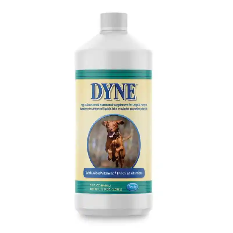 Dyne® dog supplement has a pleasant vanilla flavor to encourage even the pickiest of eaters to consume all the liquid and their food. Formulated to contain the maximum nutritional value in a small liquid volume, each ounce contains 150 calories.