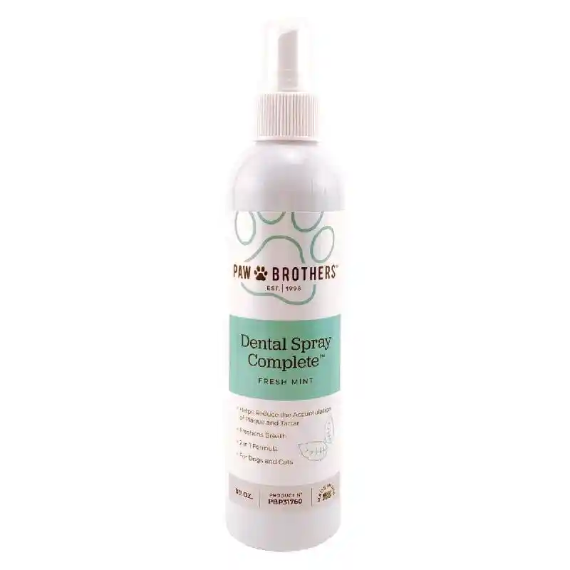 2-in-1 Formula. Paw Brothers Dental Spray Complete is a 2-in-1 formula that freshens breath while helping to reduce plaque and tartar. Use just ONE product to fight bacteria that cause offensive breath and to help to reduce the accumulation of plaque and tartar. Freshens breath with a fresh mint flavor. Designed for dogs and cats.