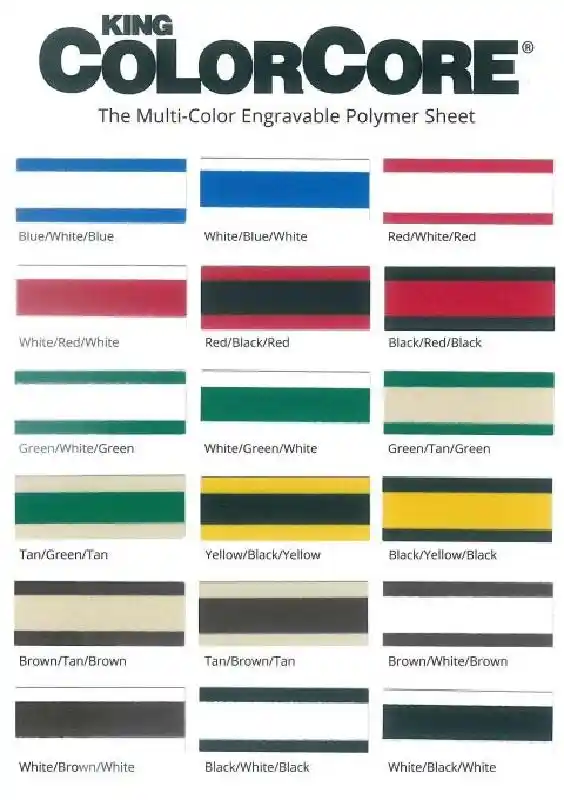 King ColorCore® is a versatile multi-color engravable high-density polyethylene sheet with multiple layers of contrasting colors. It is a superior homogeneous sheet, a product of a unique state-of-the-art continuous process called Polyfusion, and manufactured to the highest standards in the industry. King ColorCore® has a matte finish on both sides of the sheet. It is environmentally stabilized to withstand the harshest outdoor conditions. King ColorCore® will not rust, delaminate or rot when exposed to UV, humidity or water. King ColorCore® is made with high-impact-resistant polymer to handle more abuse than conventional sign materials. Its thin cap layers and bright primary colors make it ideal for signage, marine, playground and recreational applications. For maximum versatility, standard colors are made to coordinate with King ColorBoard®. The polymer sheet never needs painting or refinishing, works like wood and it is easy to fabricate using common woodworking tools and techniques. The material is easy to engrave and machine, as the cap is approximately .050” thick.