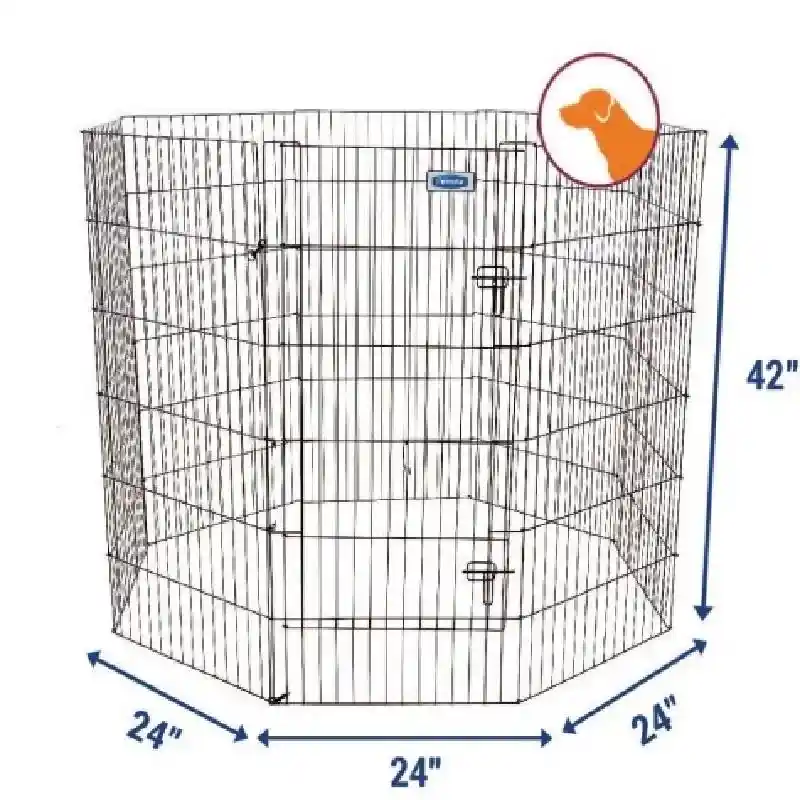 Give your pet a safe, dedicated space to run and play with the versatile Single Door Pet Exercise Pen from Petmate®. Perfect for indoor or outdoor use, this exercise pen has one double-latch door that makes it easy for pets and pet-parents to enter and exit the pen when needed. The Single Door Exercise Pen is made of durable wire with a solid hinge design, making it effortlessly easy to set up and fold down for portability and storage. It's snap hook assembly feature can attach the pen to any wire crate to give your pet even more room. Available in a variety of heights for dogs of all sizes.