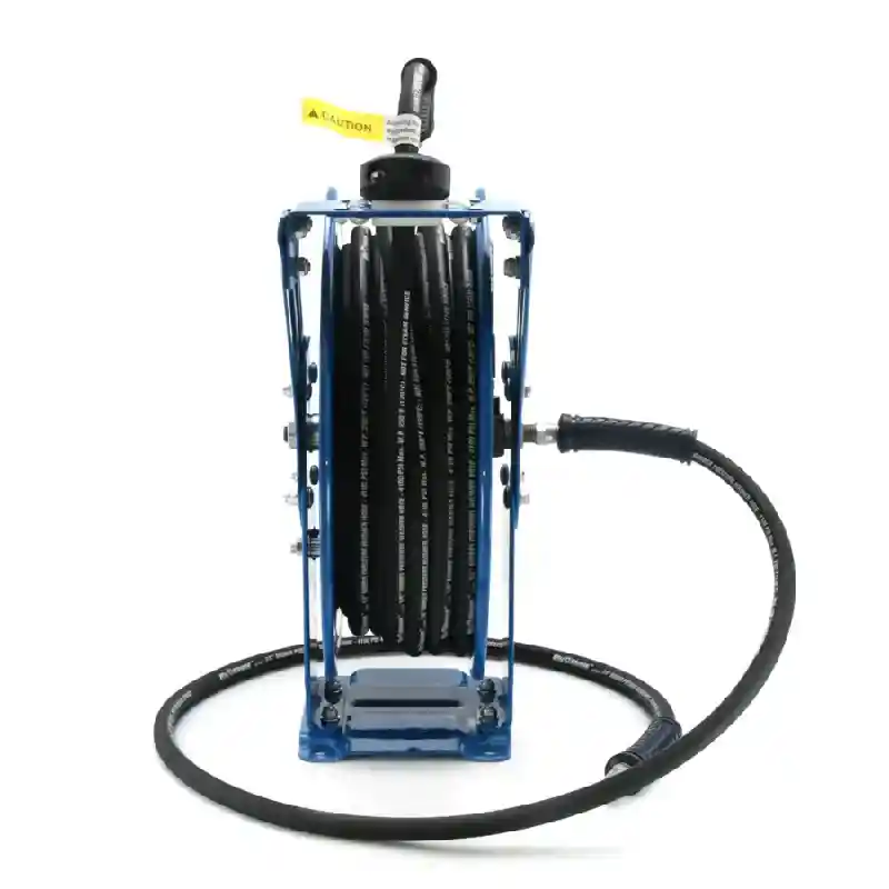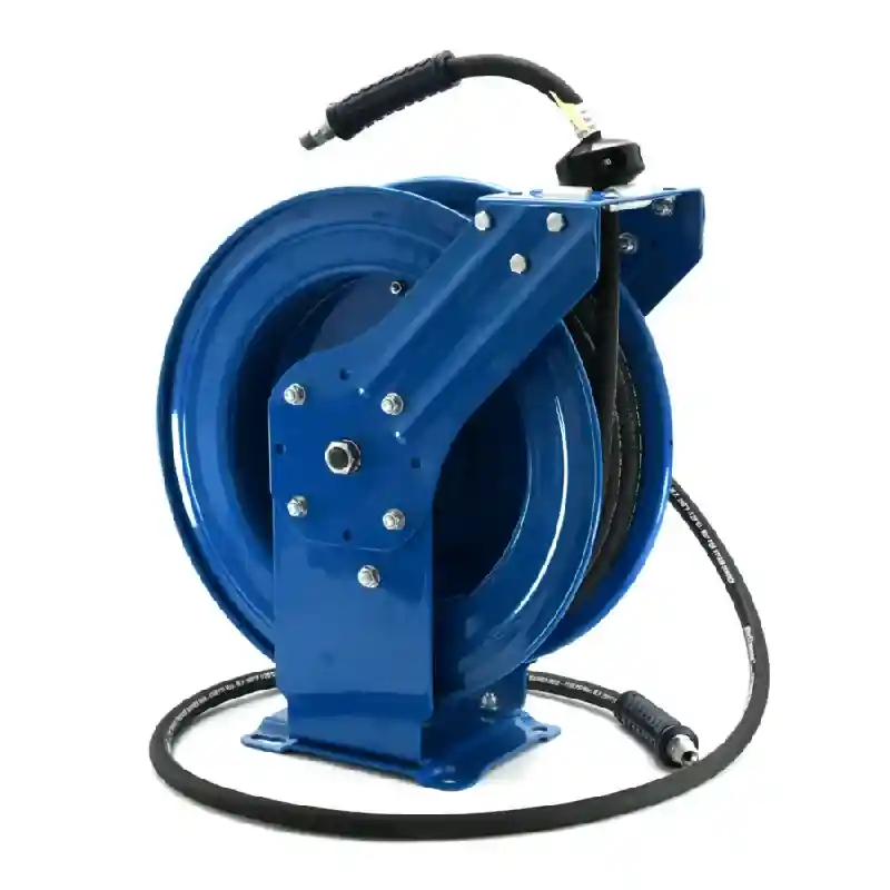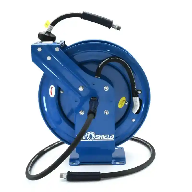 This BluBird Blushield 3/8" X 100' 4100 PSI Retractable Hose Reel is constructed with powder coated 18-gauge heavy duty steel. It features a 12-point ratchet locking mechanism and includes a kevlar braided pressure washer hose. This combo is a great cost-effective alternative to motor driven reels.