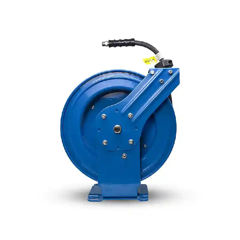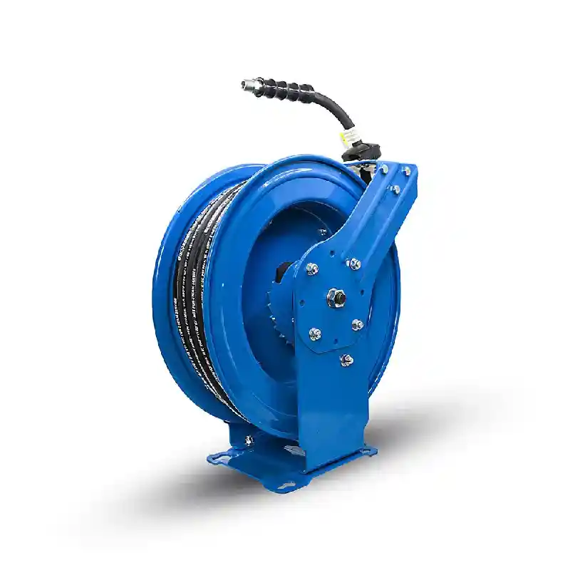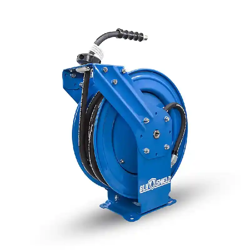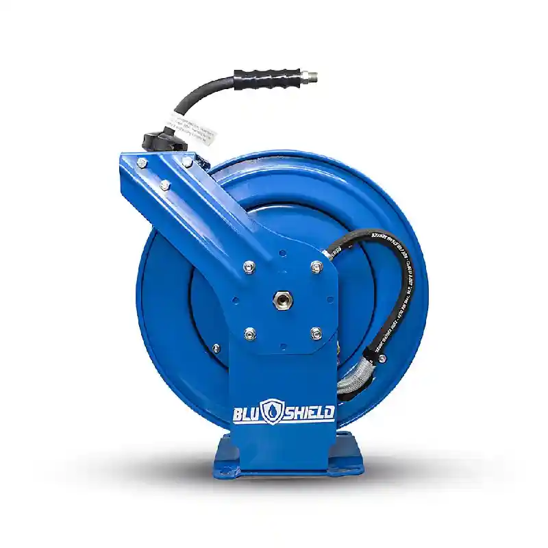 This BluBird Blushield 3/8" X 50' 4100 PSI Retractable Hose Reel is constructed with powder coated 18-gauge heavy duty steel. It features a 12-point ratchet locking mechanism and includes a kevlar braided pressure washer hose. This combo is a great cost-effective alternative to motor driven reels.